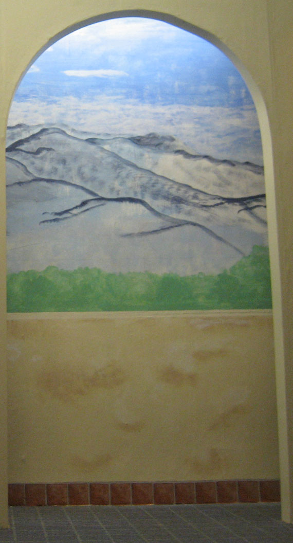 | Close up of terracotta wall tiles painted onto the lower edge of the "terrace" wall. |